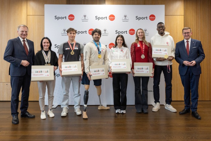 v.l.: Landeshauptmann Thomas Stelzer, Jacqueline Seifriedsberger (ehem. Skispringerin), Lukas Edl (Schwimmen), Mendy Swoboda (Para-Kanu), Susanne Gogl-Walli (Leichtathletik), Sofia Polcanova (Tischtennis), Endiorass Kingley (Leichtathletik), Wirtschafts- und Sport-Landesrat Markus Achleitner. – Foto: Land OÖ