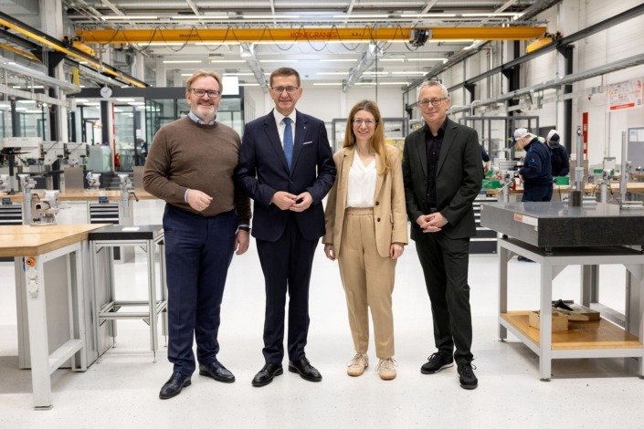 V.l.: Stefan Richter, CEO von KEBA Energy Automation, Wolfgang Mitterdorfer, Mitglied des Vorstandes voestalpine Stahl GmbH, Wirtschafts- und Forschungs-Landesrat Markus Achleitner und Klaus von Moltke, Geschäftsführer des BMW Group Werk Steyr. Foto: Land OÖ/Hermann Wakolbinger, Verwendung mit Quellenangabe.